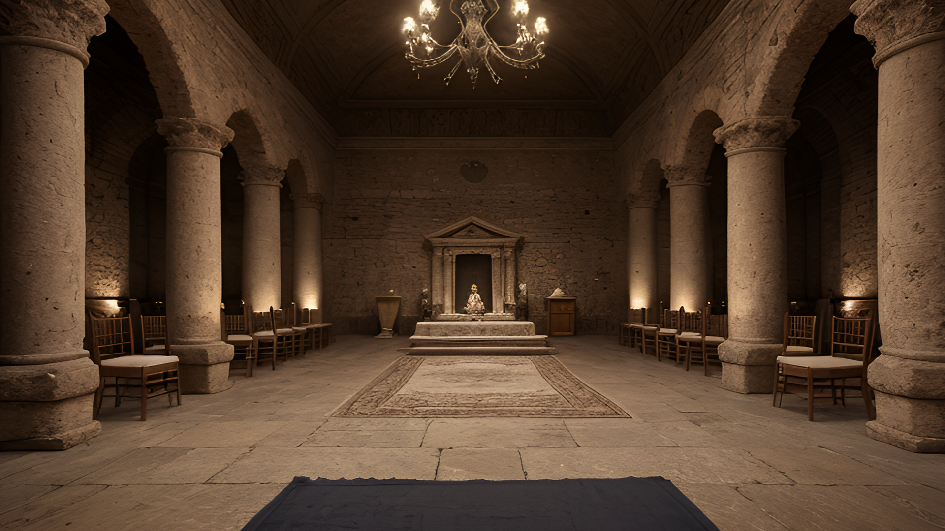 厳かな雰囲気の儀式用大広間をイメージした背景素材。王宮イベントや式典シーン、ファンタジー作品の重要な場面に使いやすい空間です。商用利用OK・クレジット不要。