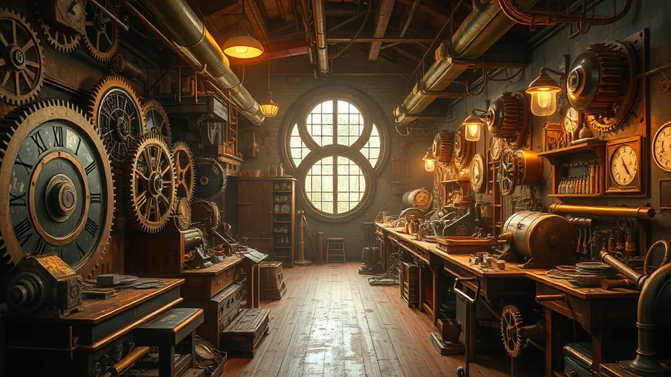 歯車と機械が並ぶ時計職人の工房。スチームパンク的で精密な雰囲気が特徴です。スチームパンク作品、職人系コンテンツ、ファンタジーゲームなどに最適。商用利用OK・クレジット不要。