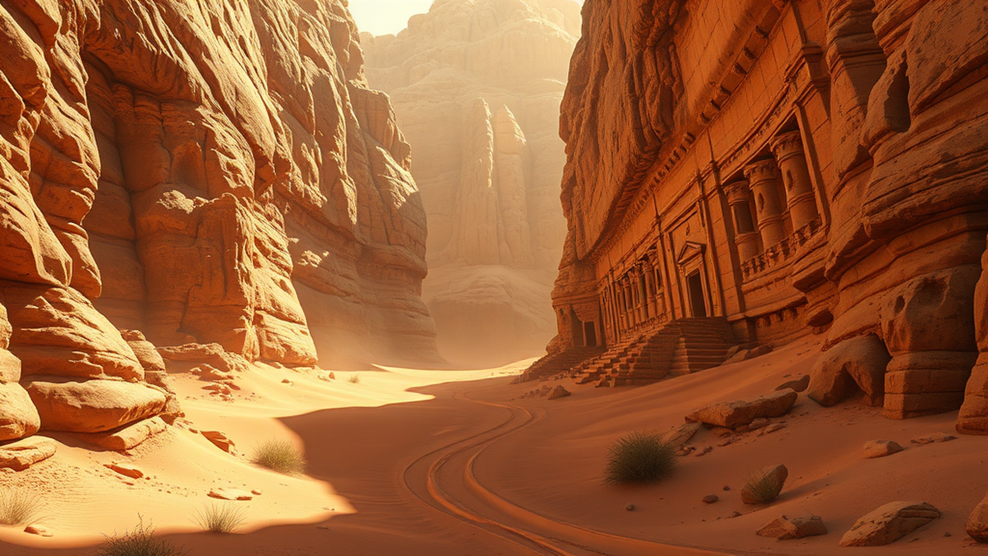 砂漠の渓谷に残る古代遺跡。壮大で神秘的な雰囲気が特徴です。冒険ゲーム、探検動画、ファンタジー作品などに最適。商用利用OK・クレジット不要。