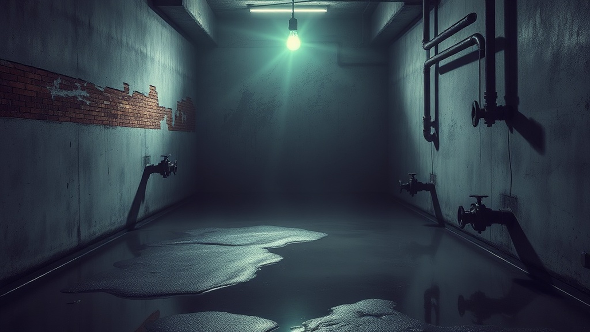 映画的な雰囲気の薄暗い地下室。重厚で緊張感のある空間を表現した背景素材です。ホラーゲーム、サスペンス作品、ミステリー動画、脱出ゲームの背景などに最適。商用利用OK・クレジット不要。