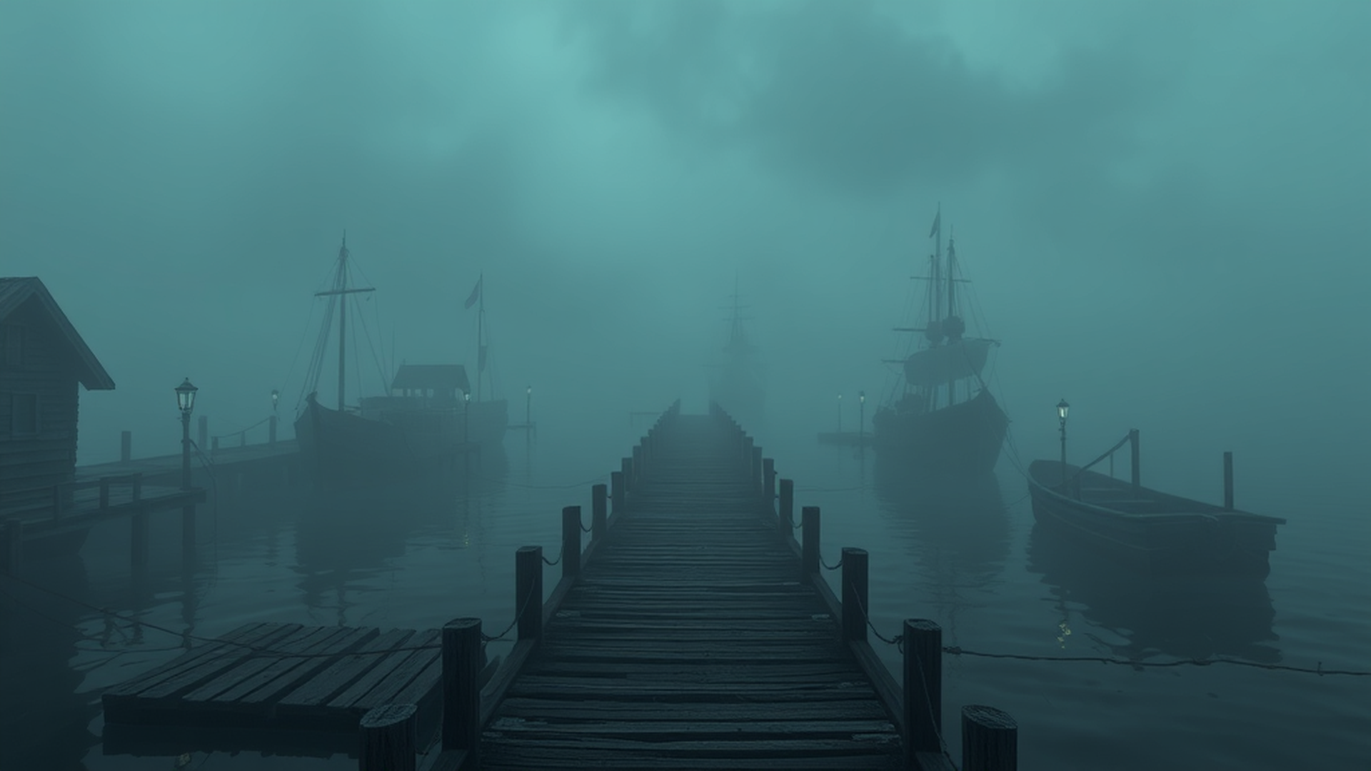 霧に包まれた港の埠頭。ミステリアスで幻想的な雰囲気が特徴です。ミステリー作品、サスペンスゲーム、雰囲気系動画などに最適。商用利用OK・クレジット不要。