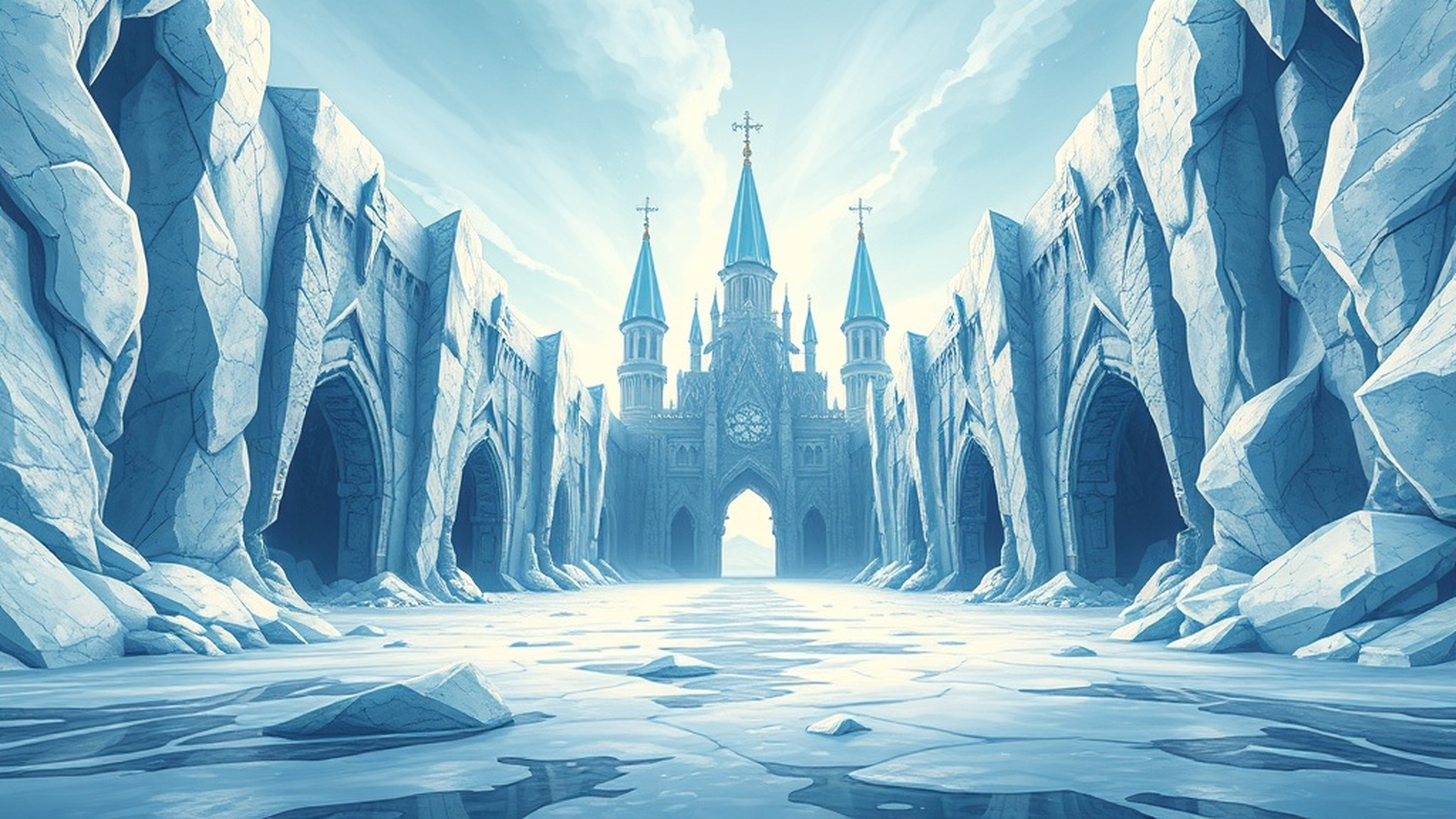 幻想的な氷の城を描いたファンタジー系背景素材。青白く輝く神秘的な雰囲気が特徴です。ファンタジーゲーム、冒険物語、冬テーマの動画背景などに活用できます。商用利用OK・クレジット表記不要。