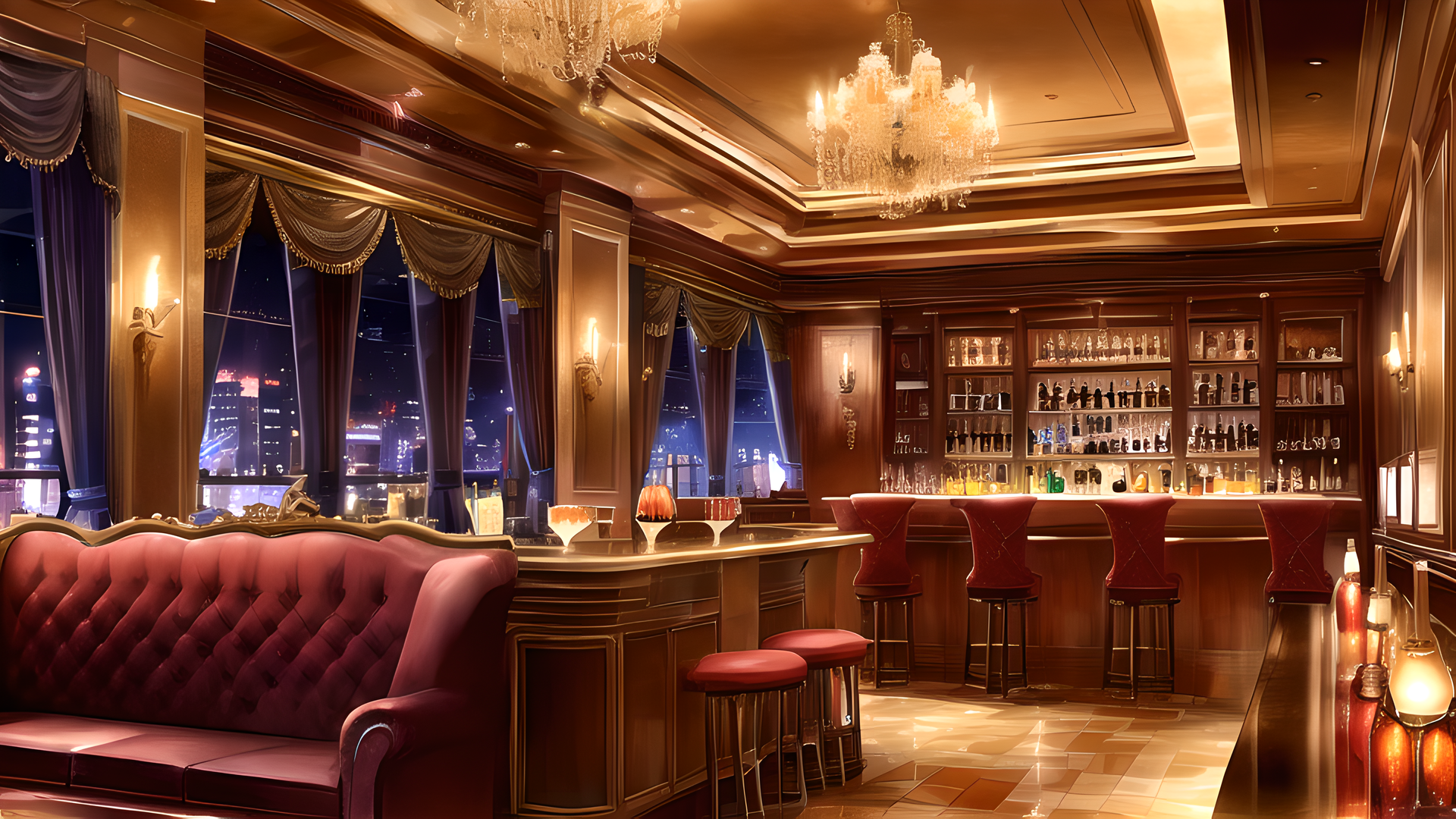 豪華な内装の高級クラブ、キャバクラ、ラウンジ、ナイトクラブや高級バーのシーンに最適。都会的な雰囲気やラグジュアリーな設定の背景素材として使えます。商用利用OK・クレジット不要。
