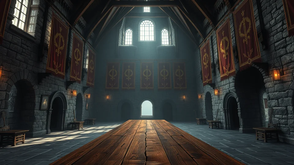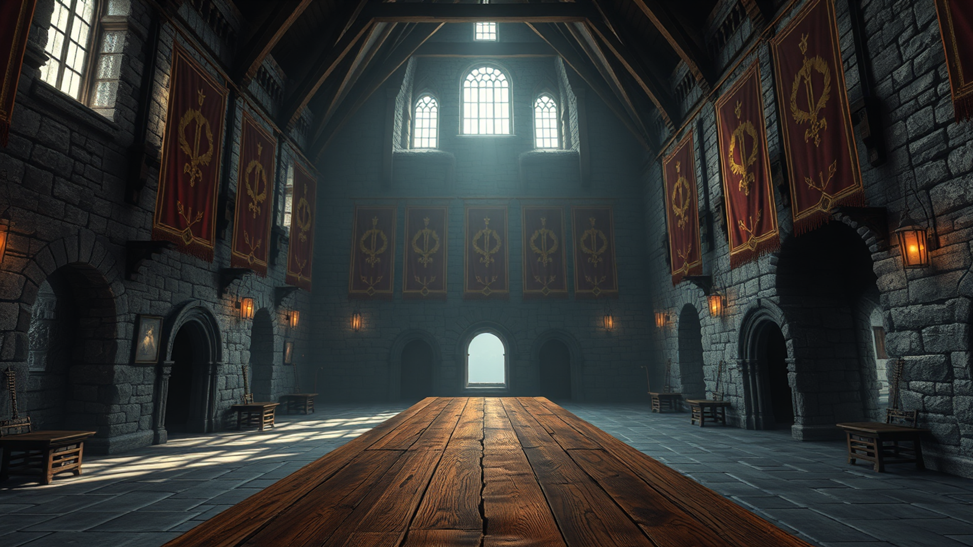 石造りの壮大な城の大広間。ファンタジー作品や中世RPGの背景に最適。