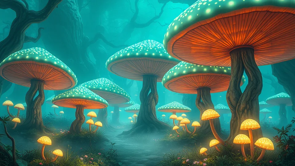 巨大なキノコが生い茂る幻想的な森。ファンタジックで不思議な雰囲気が特徴です。ファンタジーゲーム、異世界コンテンツ、メルヘン作品などに最適。商用利用OK・クレジット不要。