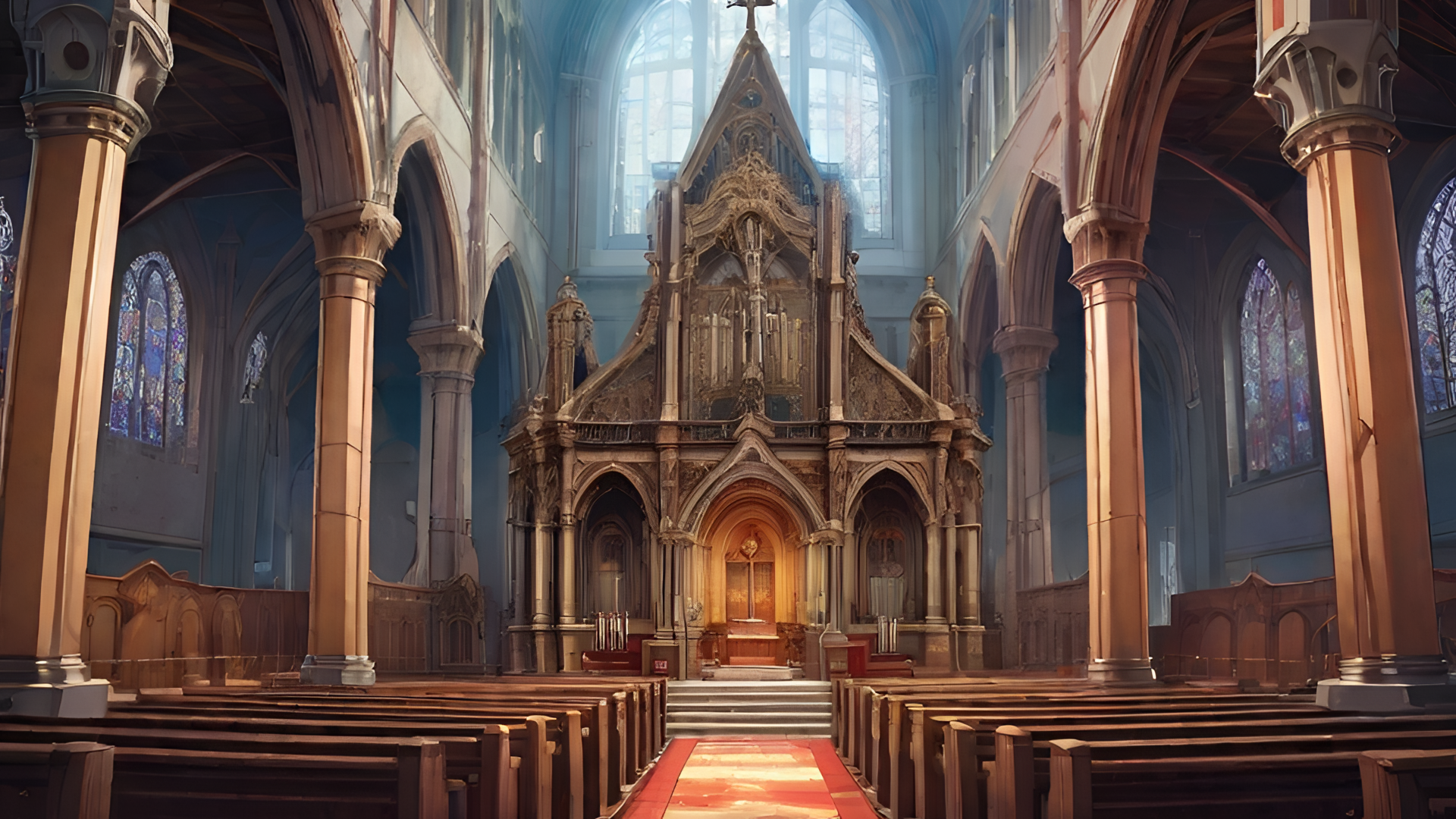 幻想的な雰囲気の教会内部。ファンタジー作品やミステリー系シーンの背景に。