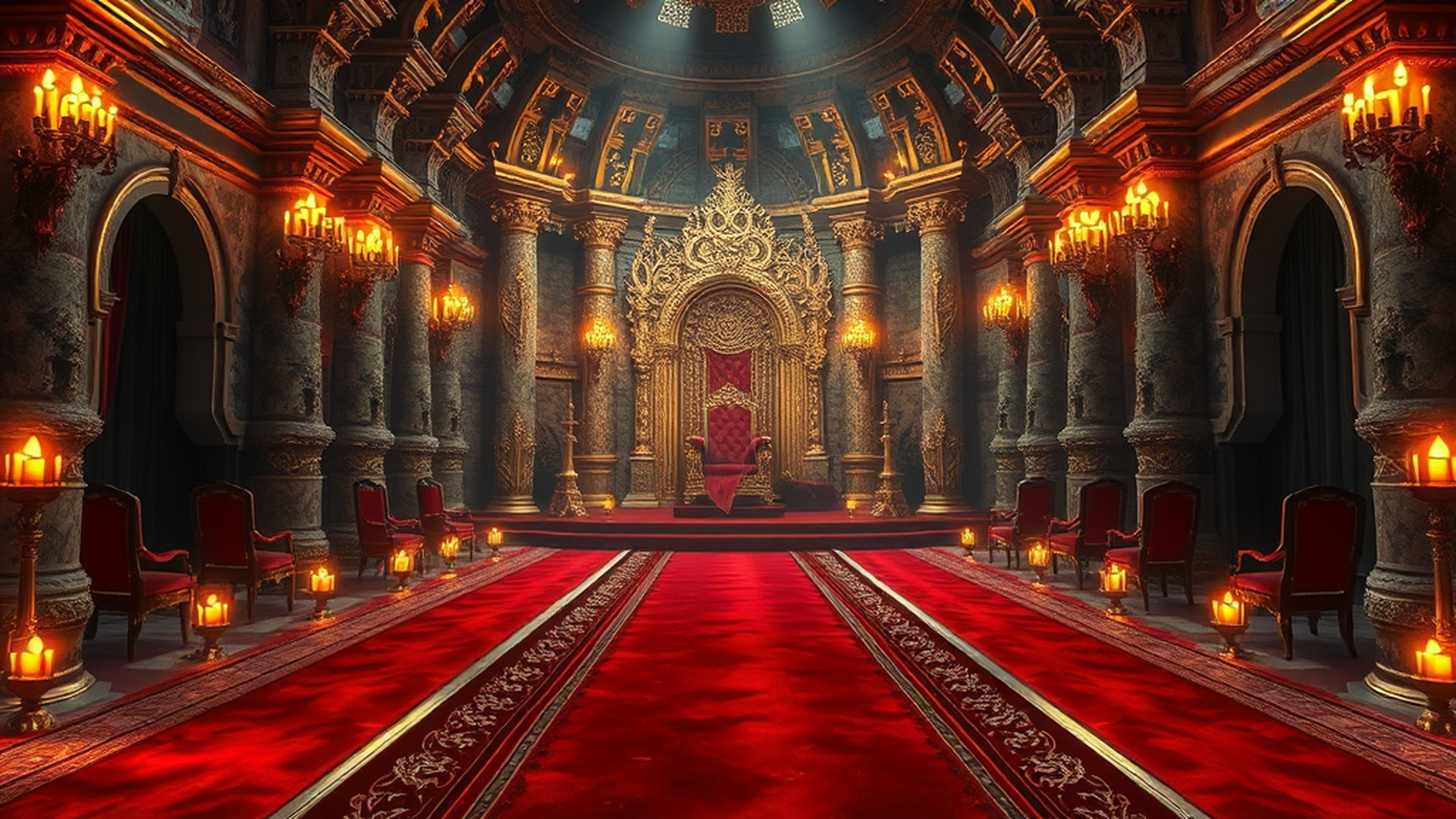 豪華な王の玉座の間の背景素材。荘厳で威厳ある雰囲気が特徴です。ファンタジーゲーム、王宮系コンテンツ、歴史作品などに最適。商用利用OK・クレジット不要。