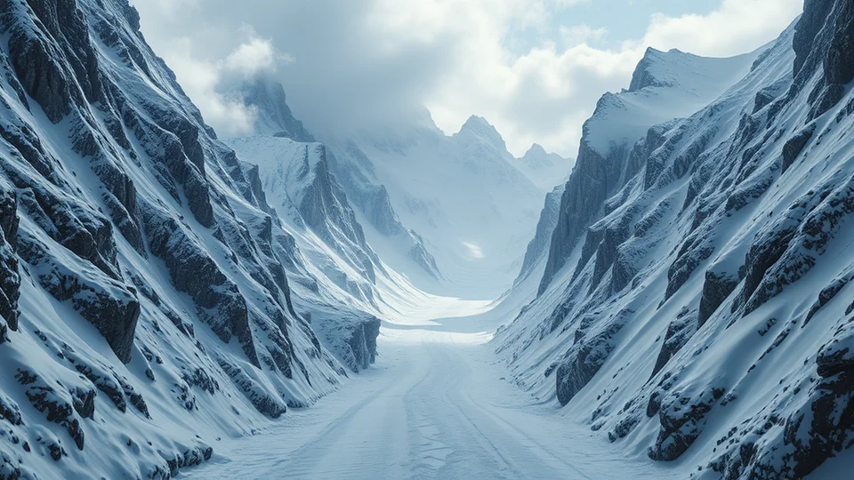 雪に覆われた険しい山道の背景素材。厳しくも美しい冬の自然が特徴です。冒険ゲーム、登山ドキュメンタリー、冬テーマ作品などに最適。商用利用OK・クレジット不要。