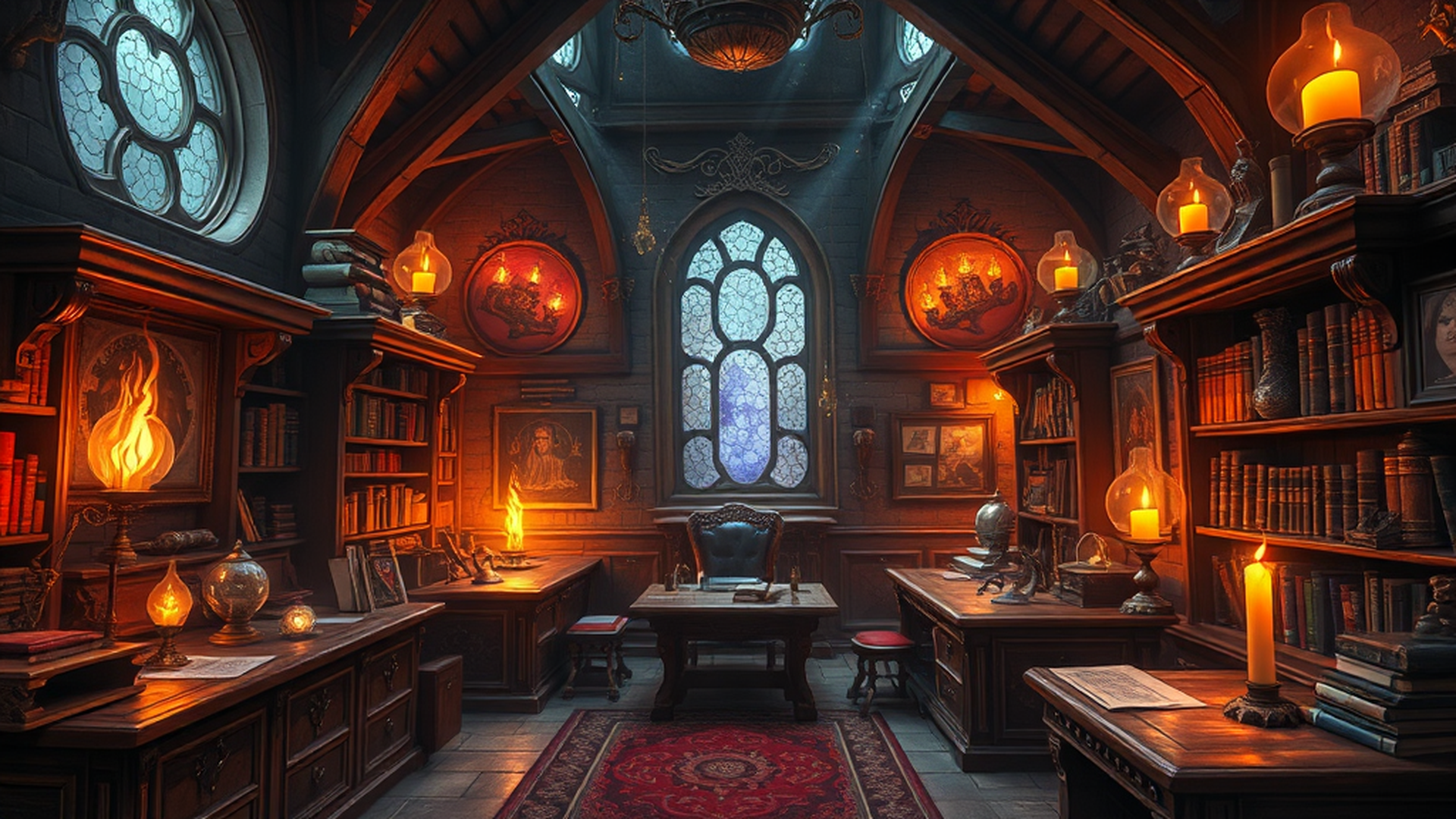 魔法使いの塔にある神秘的な書斎。魔法的で知的な雰囲気が特徴です。ファンタジーゲーム、魔法学園コンテンツ、RPG作品などに最適。商用利用OK・クレジット不要。