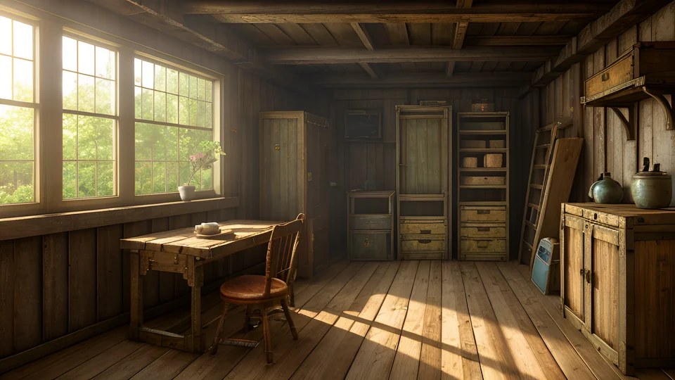 古い木造倉庫の内部。レトロな雰囲気やノスタルジックなシーン、ミステリー作品の背景に最適。古びた倉庫の雰囲気を演出できる背景素材です。商用利用OK・クレジット不要。